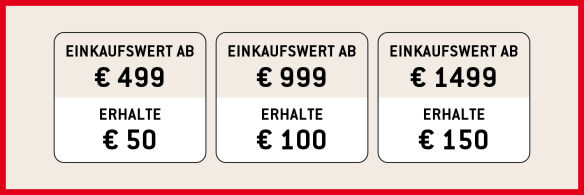 Je nach erreichtem Einkaufswert erhältst du einen der nachfolgenden Cashback-Beträge innerhalb von 4-6 Wochen nach Registrierung des Kaufbelegs und Angabe deiner Bankverbindung: