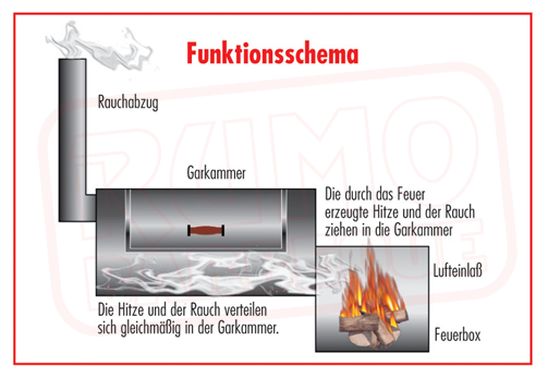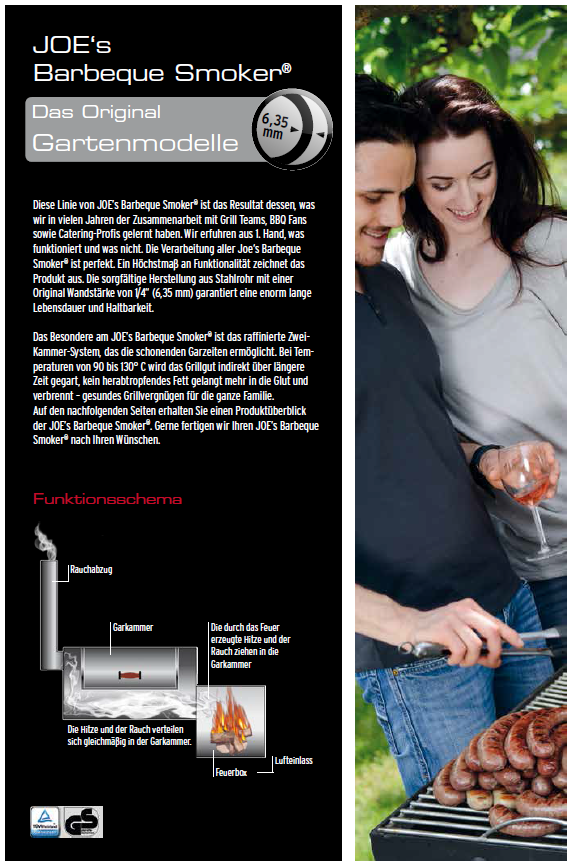 Solide Stahlverarbeitung aus 6,35 mm starkem Stahlrohr, Sandgestrahlt und mit einer 850 C hitzebeständigen Farbe beschichtet. Garkammer und Räucherkammer von einem Standpunkt bedienbar, Ideale Temperaturkontrolle durch Dual Damping System. Edelstahl Thermometer an der Garkammer und Räucherkammer. Mit massiven Eisenrädern vom Rohr geschnitten garantieren Stabilität und Rundlauf. Komplett mit Edelstahlrosten bestück (6 mm Stabstärke). 5 Rostebnen in der senkrechten Räucher- und Warmhaltekammer Massives Feuerboxrost aus 16 mm Stabeisen mit Kochplatte auf dem Feuerboxdeckel Große Frontablage an der Garkammer und Feuerbox Großes Ablagetisch für Brennholz Aufnahmeösen für Schwenkarm ( Schwenkarm als Zubehör erhältlich JS-8016)