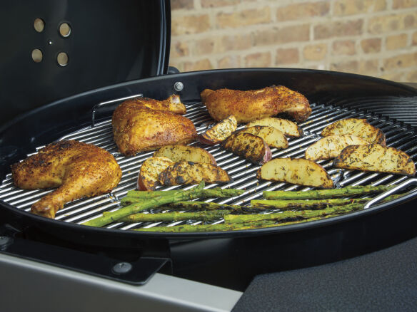 Der Performer Premium GBS ist mit einem witterungsbeständigen Kohlevorratsbehälter ausgestattet und verhindert so, dass dein Holzkohlesack im Garten oder in der Garage herumliegt. Stattdessen befindet er sich dort, wo er hingehört: in deiner Nähe, damit du schnell Kohlen nachlegen kannst. Des Weiteren verfügt der Grill über zwei praktische Holzkohlekörbe. Mithilfe dieser Körbe kannst du ganz einfach deine Briketts passend zur gewünschten Grillmethode anordnen. Schiebe sie zusammen, um über direkter Hitze Steaks scharf anzubraten, oder schiebe sie auseinander, um über indirekter Hitze langsam ein ganzes Hähnchen zu garen. Das durchdachte Design setzt sich auch im Inneren des Grills fort: Ein robuster, formstabiler Holzkohlerost aus Stahl bietet Platz für jede Menge heiße Briketts. Die Stäbe sind so eng beieinander, dass die schrumpfenden Kohlen nicht durch sie hindurchfallen. Und wenn du Holzkohle nachlegen oder einen Blick auf das Grillgut werfen musst, kannst du den Grilldeckel einfach in den Deckelhalter Tuck-Away schieben und hast so immer deine Hände frei. Nach dem Grillen Mithilfe des One-Touch-Reinigungssystems aus Edelstahl kannst du die Asche der Holzkohle einfach aus dem Kessel in den großen, herausnehmbaren, schwarzen Aschetopf aus Aluminium befördern. So bleibt der Ruß an einem verschlossenen Ort – perfekt zum schnellen und mühelosen Reinigen.