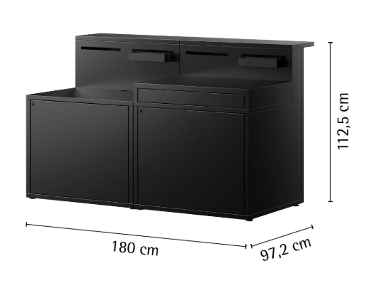 Dank umlaufender Rückwand und optional montierbarer Theke kann DIE PRAKTISCHE sowohl wandnah als auch freistehend mit Bartresen aufgebaut werden.